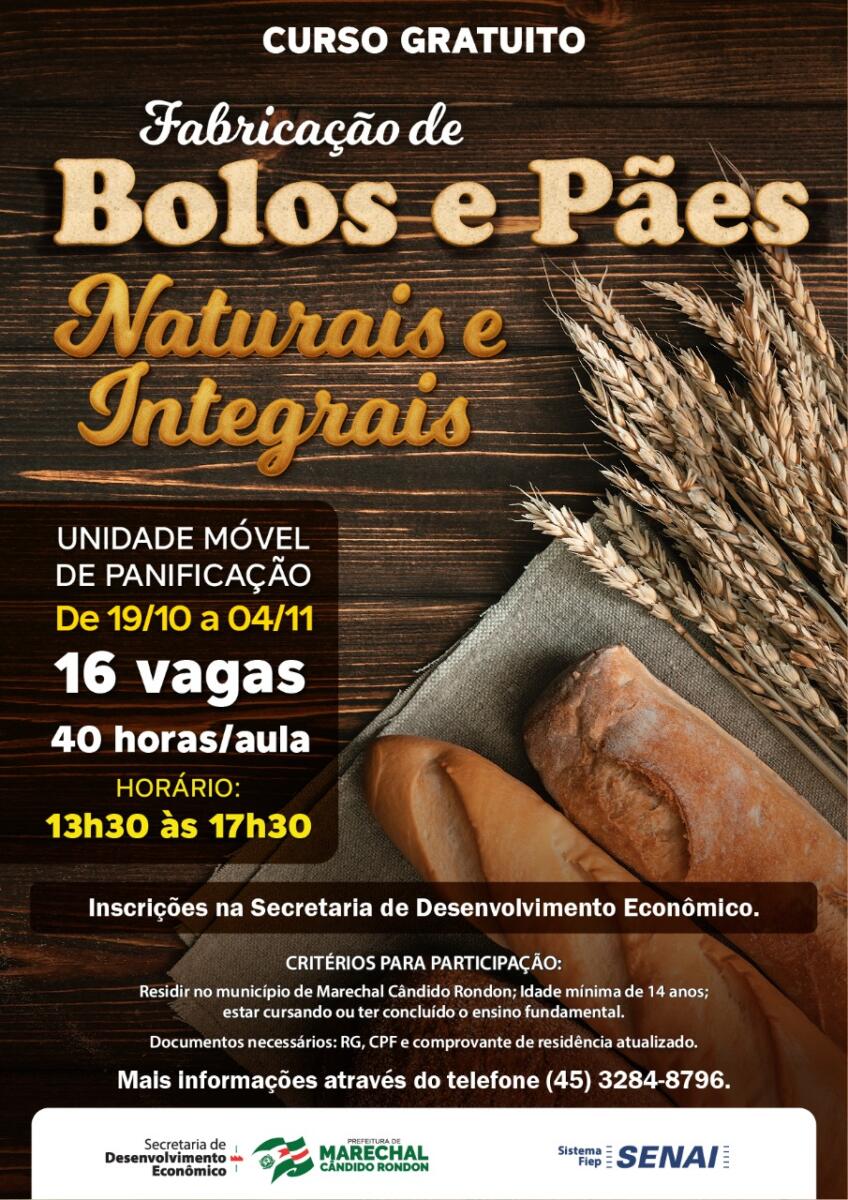 No dia 19, também, terá início o curso de fabricação de bolos e pães naturais e integrais. As aulas acontecem das 13h30 às 17h30, totalizando 40 horas/aula.