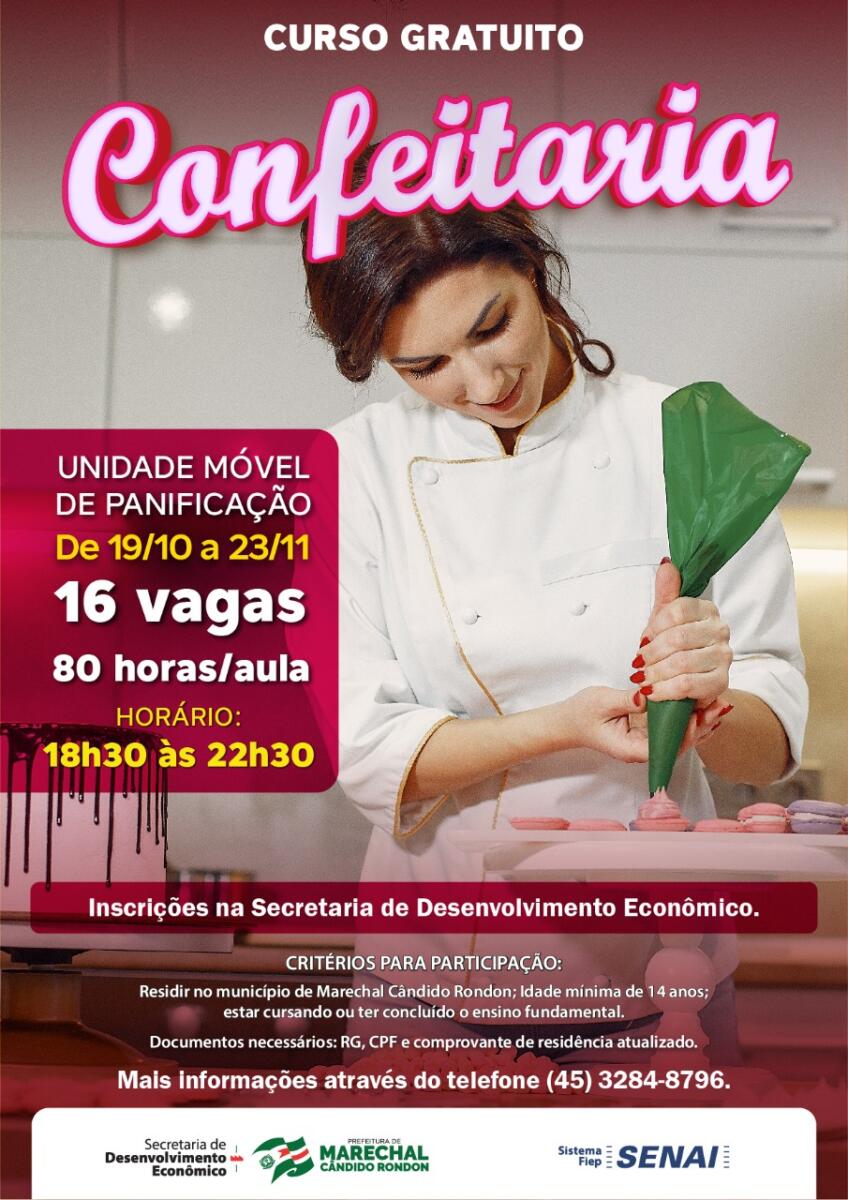 No dia 19, inicia o curso de confeitaria, das 18h30 às 22h30, totalizando 80 horas/aula. Serão oferecidas 16 vagas.