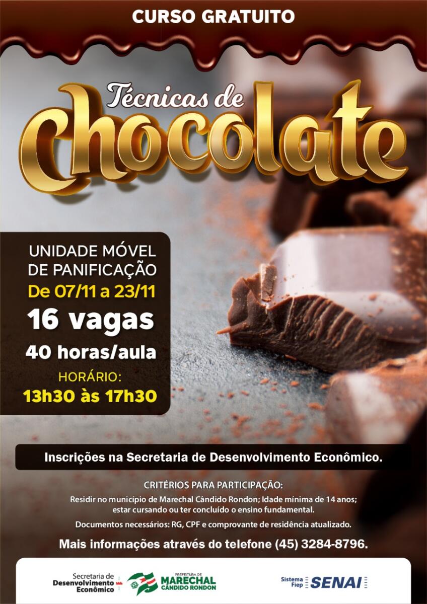 Já no dia 07 de novembro iniciará o curso de técnicas de chocolate, para 16 participantes. Também serão 40 horas/aulas, sendo que a capacitação acontece das 13h30 às 17h30.