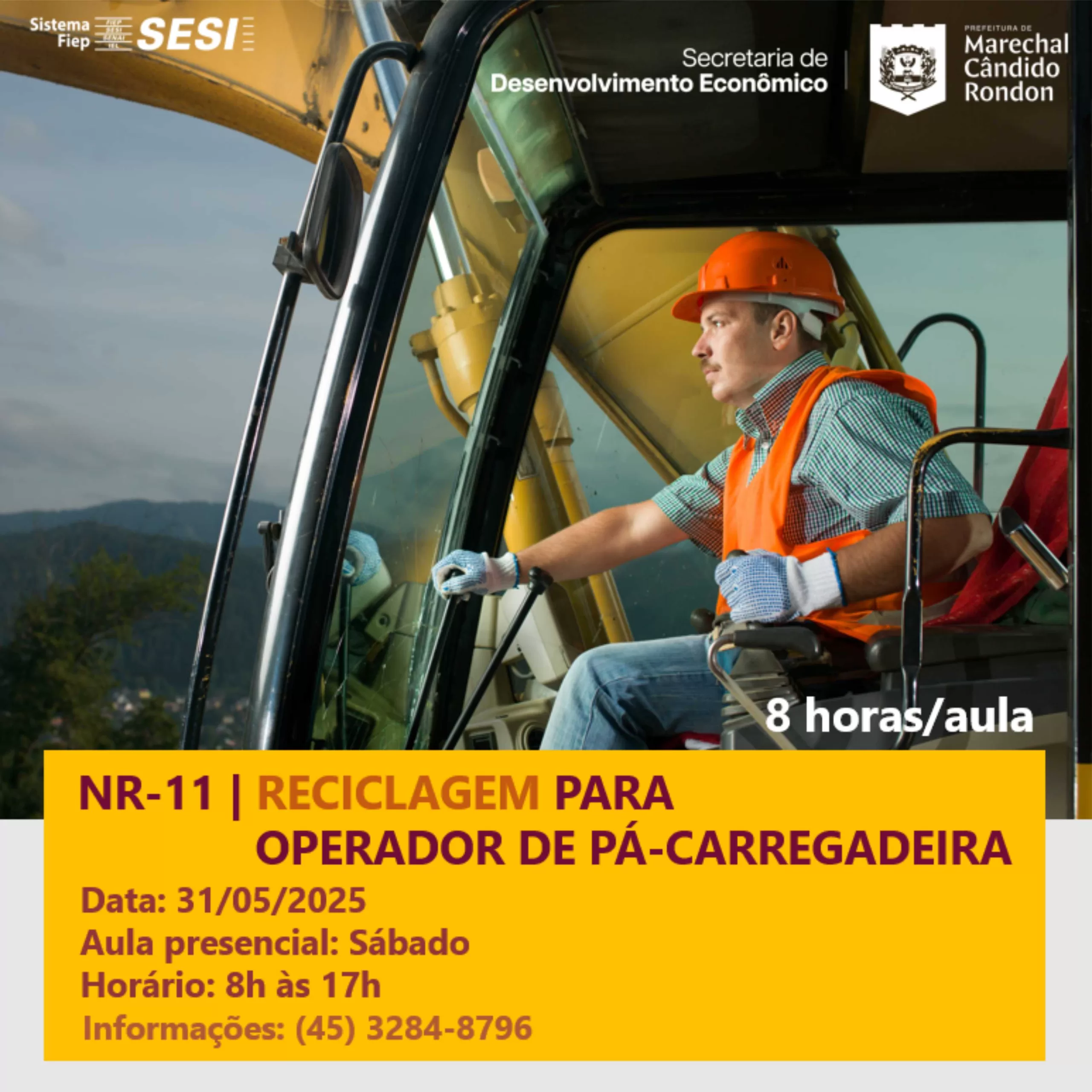 A Secretaria de Desenvolvimento Econômico de Marechal Cândido Rondon abriu as inscrições para a reciclagem do curso NR-11 destinado a operadores de pá-carregadeiras. O curso é exclusivo para aqueles que já possuem formação em NR-11 para operação de pá-carregadeira.