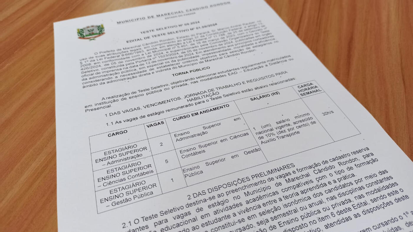 Oito vagas de estágio remunerado para contratar estudantes de ensino superior, nas modalidades Educação a Distância (EAD) e presencial, estão abertas pela prefeitura de Marechal Cândido Rondon.