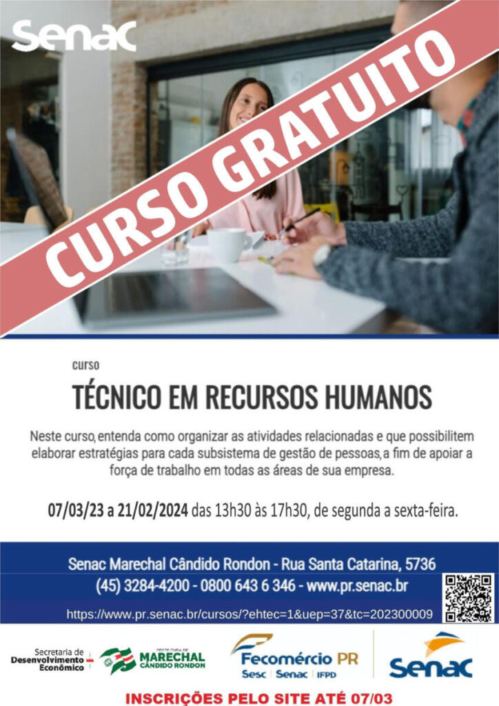 Parceria entre a prefeitura de Marechal Cândido Rondon, através da Secretaria de Desenvolvimento Econômico, e o Senac, possibilita a realização de importante capacitação de atualização profissional. Trata-se do curso gratuito de técnico em recursos humanos, com 800 horas/aula, de segunda a sexta-feira, das 13h30 às 17h30. A capacitação, que será realizada entre março deste ano e fevereiro de 2024, visa ensinar a organizar as atividades relacionadas, de forma que possibilite elaborar estratégias para cada subsistema de gestão de pessoas, a fim de apoiar a força de trabalho em todas as áreas de uma empresa.