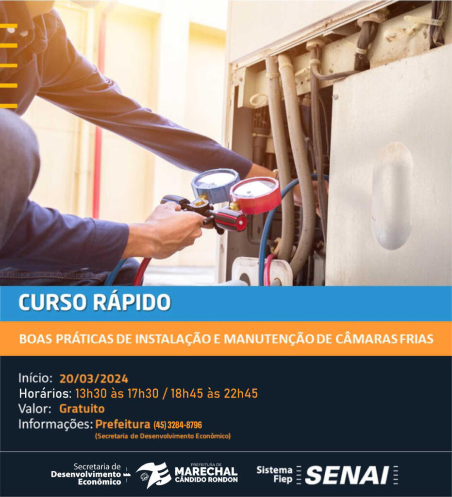 Um dos cursos é o de “boas práticas de instalação e manutenção de câmaras frias”, com turmas à tarde (das 13h30 às 17h30) e à noite (das 18h45 às 22h45), com total de 32 horas/aula.