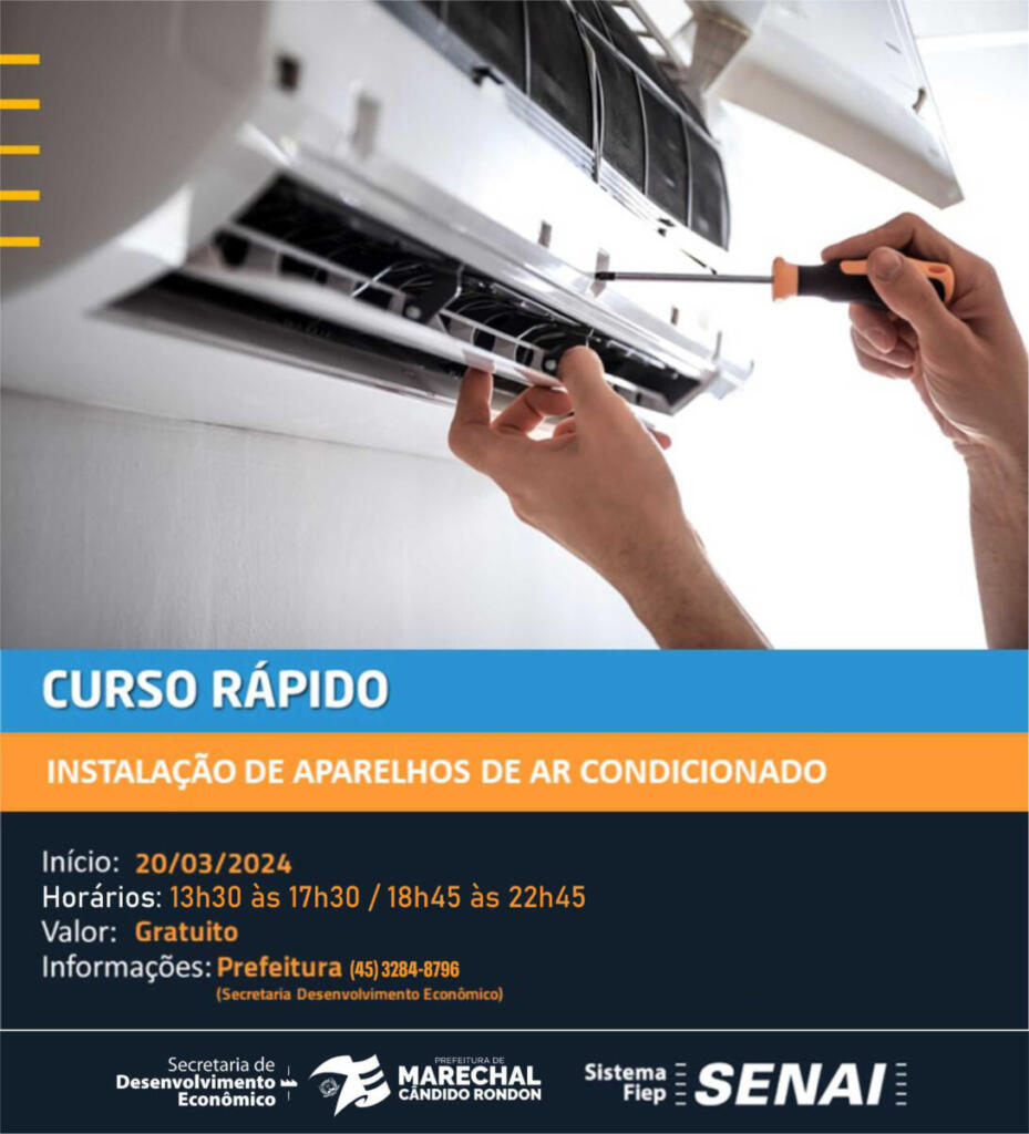 A outra capacitação é de “instalação de aparelhos de ar-condicionado”, também com turmas à tarde (das 13h30 às 17h30) e à noite (das 18h45 às 22h45), com total de 48 horas/aula.