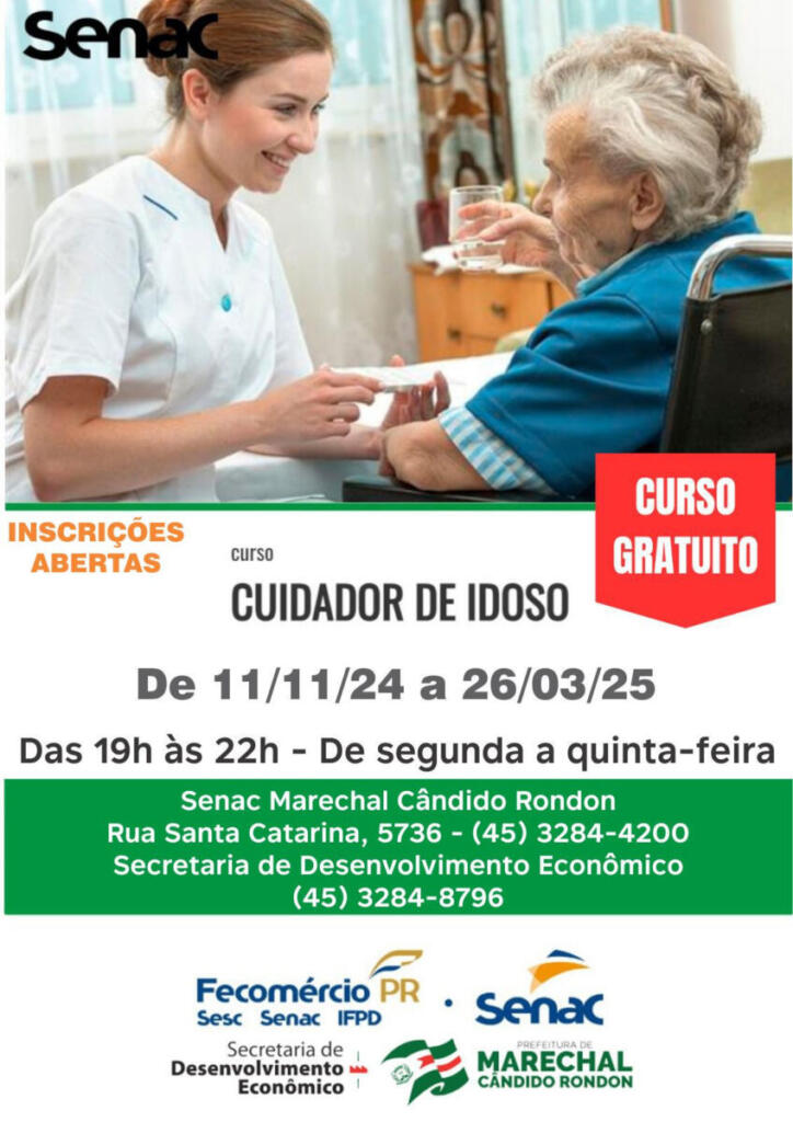 O Senac e a Prefeitura de Marechal Cândido Rondon, através da Secretaria de Desenvolvimento Econômico, promovem curso de cuidador de idoso.