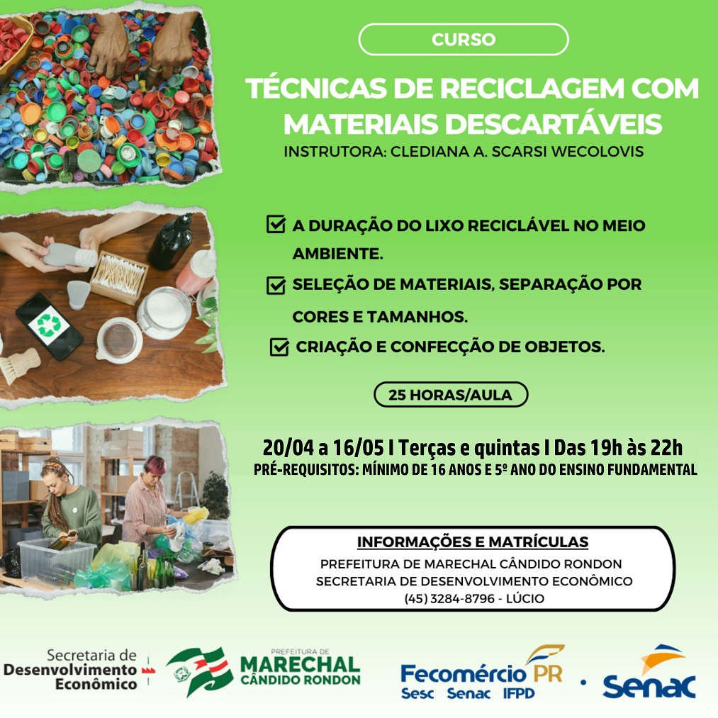 A prefeitura de Marechal Cândido Rondon, através da Secretaria de Desenvolvimento Econômico, em parceria com o Senac, promoverá o curso “Técnicas de Reciclagem com Materiais Descartáveis”, que objetiva proporcionar o desenvolvimento de técnicas para a reciclagem de materiais descartáveis, visando a produção de matéria-prima para a confecção de objetos para comercialização.