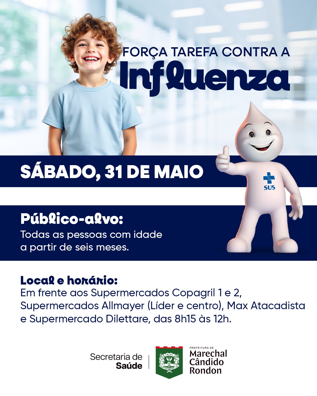 Neste sábado (31), mais uma ação visa intensificar a vacinação contra a influenza. As doses do imunizante estarão disponíveis das 8h15 às 12 horas, para a população nos seguintes pontos do município: