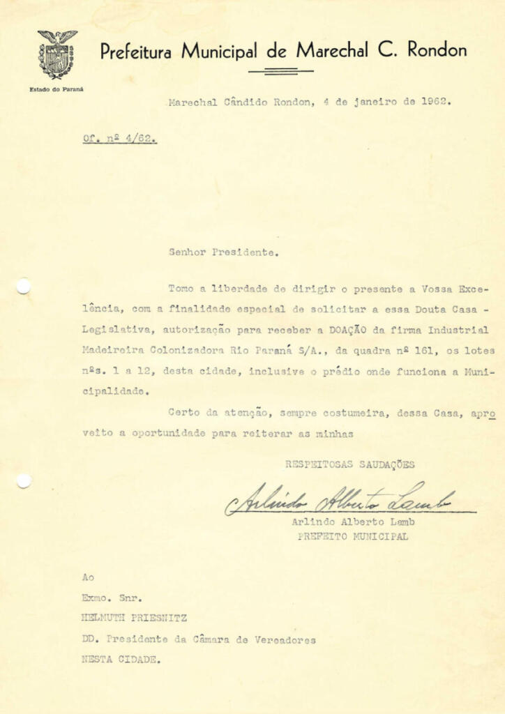 Entre eles está o Ofício 4/62, de 4 de janeiro de 1962, encaminhado pelo prefeito Arlindo Lamb ao presidente da Câmara de Vereadores, Helmuth Priesnitz. Nele, o chefe do Poder Executivo pede ao Poder Legislativo que autorize o Município a receber da Madeireira Colonizadora Rio Paraná S/A – Maripá a doação do lote e do prédio onde funcionava a empresa, que passou a ser utilizado, então, como a primeira Prefeitura de Marechal Cândido Rondon.