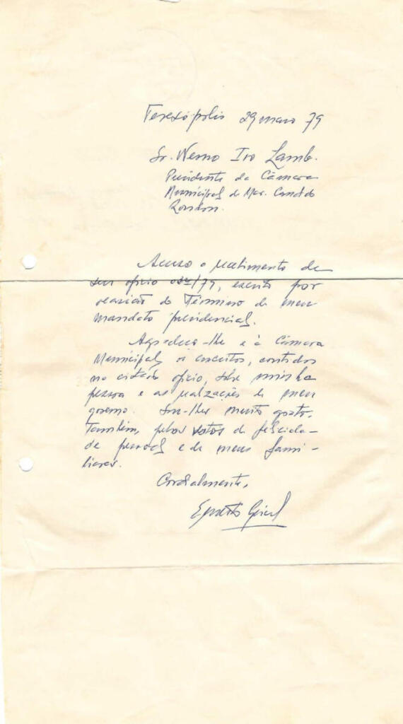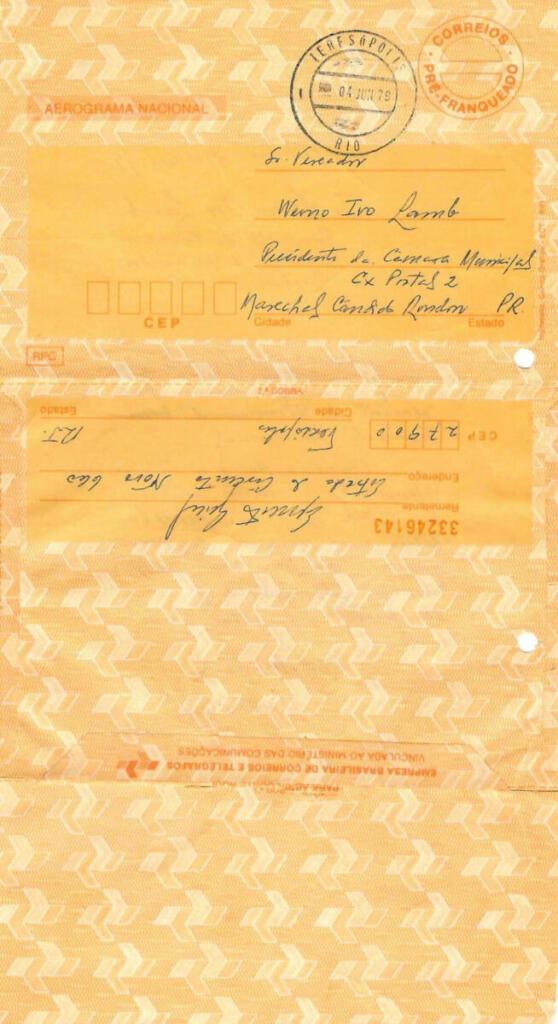 Outro documento encontrado, e provavelmente um dos mais interessantes, é uma carta datada de 29 de maio de 1979 e escrita à mão por Ernesto Geisel, então ex-presidente do Brasil. O Aerograma Nacional foi enviado de Teresópolis (RJ) ao presidente do Poder Legislativo de Marechal Cândido Rondon na época, Werno Ivo Lamb.