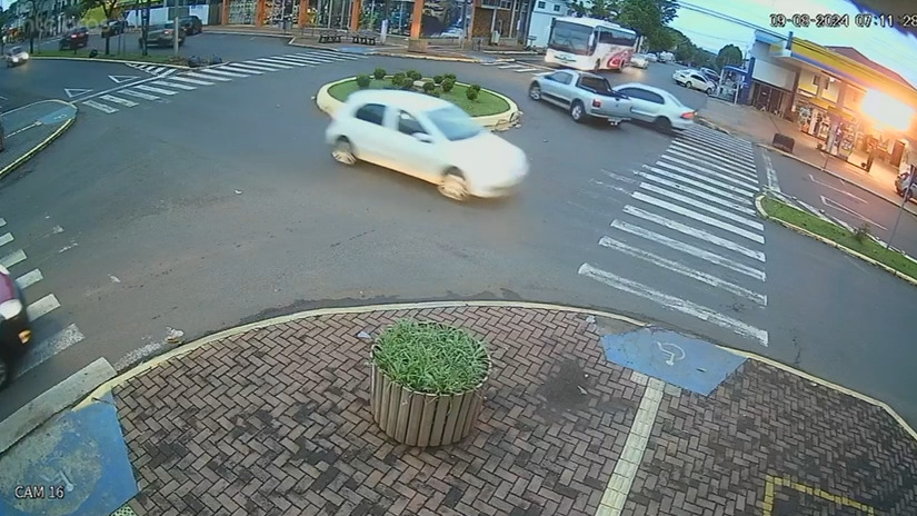 Um acidente de trânsito foi registrado na manhã desta sexta-feira (09), por volta das 8 horas, na rotatória da Avenida Rio Grande do Sul com a Rua Mem de Sá (esquina do Posto da Mirta e da Imobiliária Activa), no centro de Marechal Cândido Rondon.