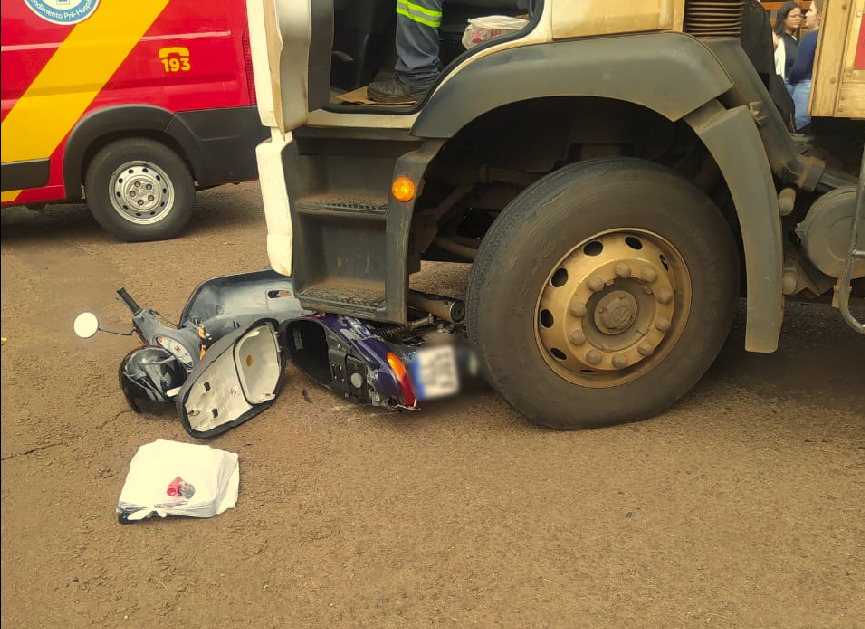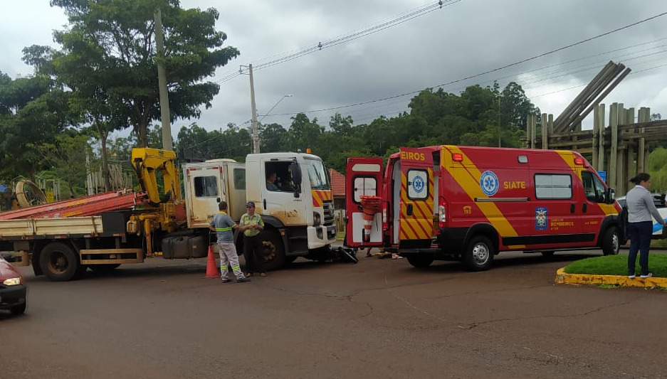 O condutor da motocicleta teve uma queda brusca e a moto parou embaixo do para-choque do caminhão. O motociclista foi socorrido pelo Corpo de Bombeiros e encaminhado para atendimento médico na Unidade de Pronto Atendimento (UPA).
