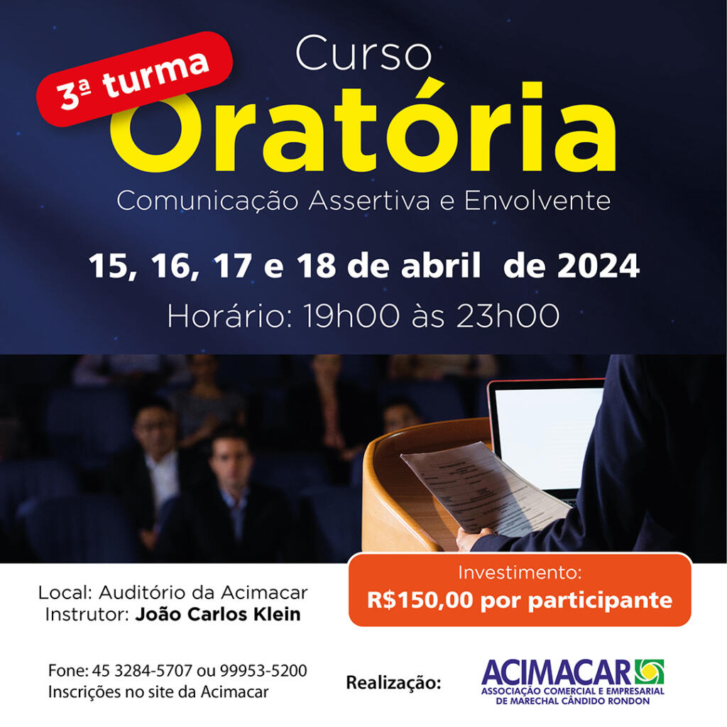 A comunicação eficaz é uma habilidade fundamental em todos os aspectos da vida e especialmente importante no mundo dos negócios e das relações interpessoais. É com esse entendimento que Associação Comercial e Empresarial de Marechal Cândido Rondon (Acimacar), realiza o curso “Oratória: comunicação assertiva e envolvente”.