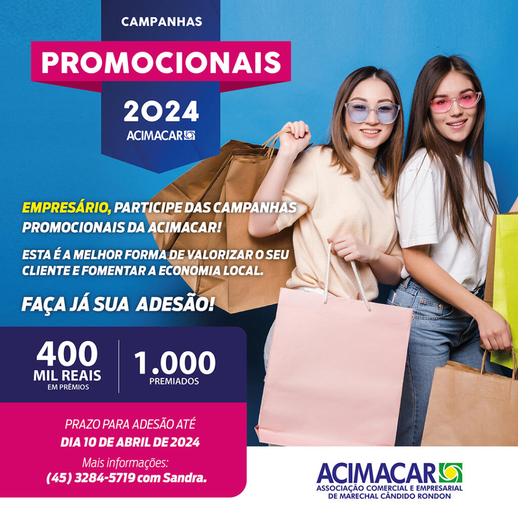 As empresas do comércio de Marechal Cândido Rondon, associadas à Associação Comercial e Empresarial de Marechal Cândido Rondon (Acimacar), tem a oportunidade de aderir a maior campanha promocional realizada anualmente pela entidade, Campanha “Amor sempre Presente” para Dia das Mães, Dia dos Pais e Dia das Crianças e Campanha Natal Premiado.
