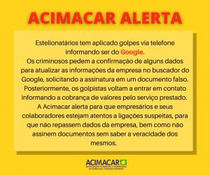A Acimacar alerta para que empresários e seus colaboradores estejam atentos a ligações suspeitas, para que não repassem dados da empresa ou número de celular particular, bem como não assinem documentos sem saber a veracidade dos mesmos.