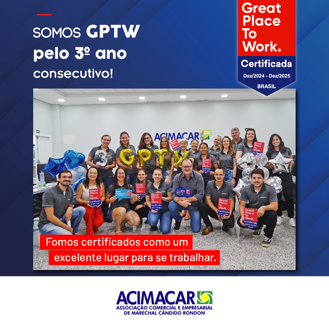 A Associação Comercial e Empresarial de Marechal Cândido Rondon (Acimacar) recebeu, pelo terceiro ano consecutivo, a certificação Great Place to Work (GPTW), reconhecimento que destaca as melhores empresas para se trabalhar. A associação obteve uma excelente pontuação de 97, o que reforça ainda mais a qualidade do seu ambiente organizacional. Esta conquista reforça o compromisso da entidade com um ambiente de trabalho saudável, colaborativo e inovador.