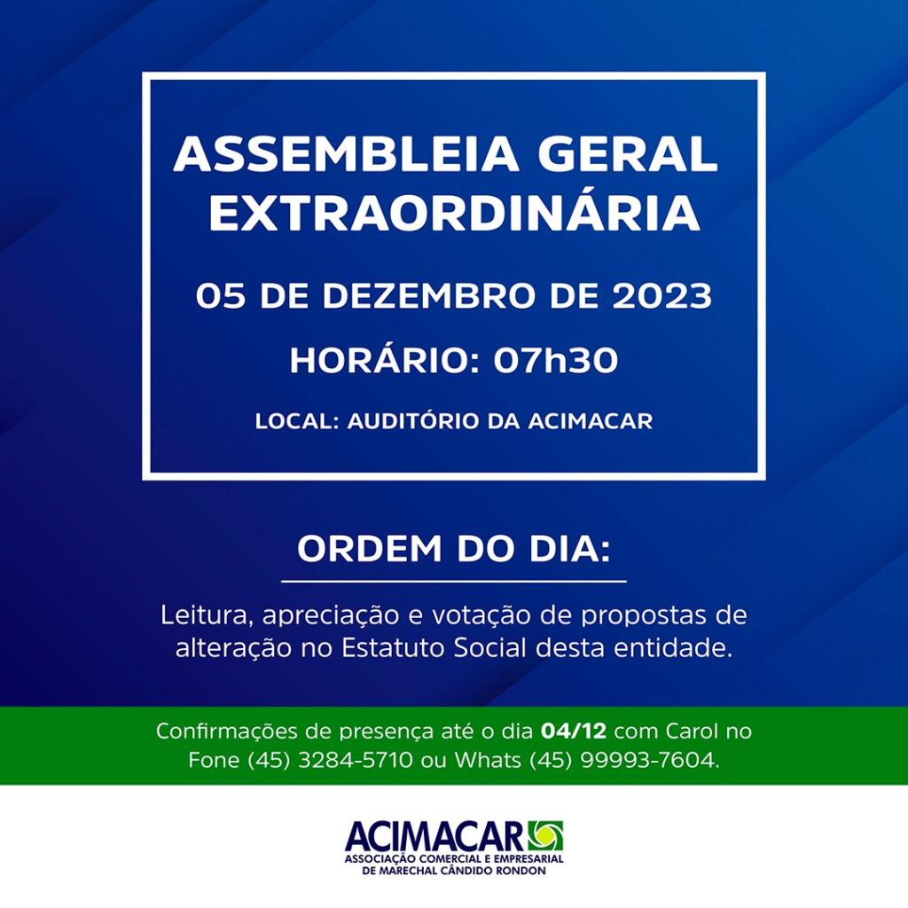 A Associação Comercial e Empresarial de Marechal Cândido Rondon (Acimacar), por meio de seu presidente Paulo Adriano Grenzel, convoca os empresários associados para participação na Assembleia Geral Extraordinária (AGE) da entidade.