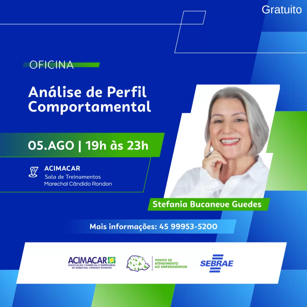 Com objetivo de oferecer um voo panorâmico sobre o impacto do comportamento humano no desempenho das tarefas e das entregas no ambiente das empresas, a Associação Comercial e Empresarial de Marechal Cândido Rondon (Acimacar) e o Ponto de Atendimento ao Empreendedor do Serviço Brasileiro de Apoio às Micro e Pequenas Empresas (Sebrae) promovem, na terça-feira, cinco de agosto, a oficina “Análise de Perfil Comportamental – Alinhando pessoas e resultados”.