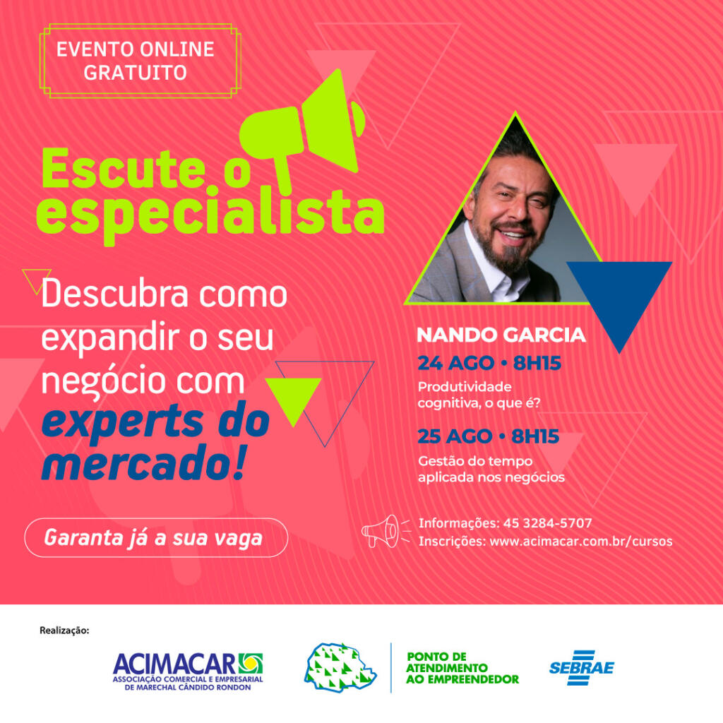 Pensando nisso, a Associação Comercial e Empresarial de Marechal Cândido Rondon (Acimacar) e o Ponto de Atendimento ao Empreendedor do Sebrae promovem o evento “Escute o Especialista” com uma rodada de palestras sobre gestão do tempo. Realizada de forma online e gratuita, a palestra ocorre nos dias 24 e 25 de agosto, quarta e quinta-feira, e será comandada pelo palestrante Nando Garcia.