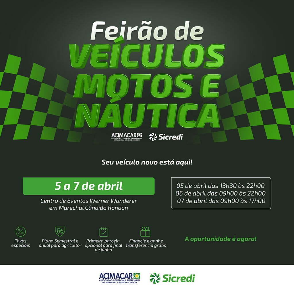 A Associação Comercial e Empresarial de Marechal Cândido Rondon (Acimacar), em parceria com a Sicredi Aliança PR/SP, realiza, neste fim de semana – de sexta-feira (5) a domingo (7), o tradicional Feirão de Veículos Acimacar/Sicredi.