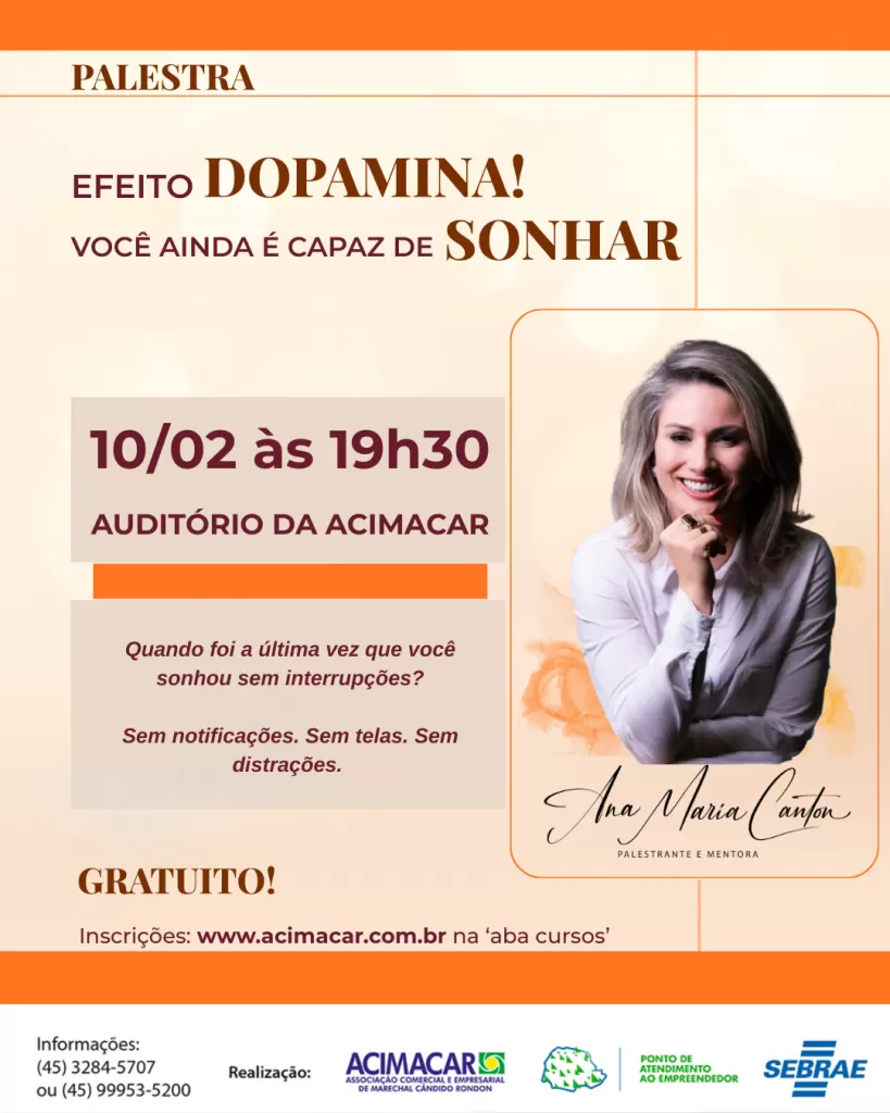Com o tema “Efeito dopamina – você ainda é capaz de sonhar”, o encontro acontece no Auditório Dirceu da Cruz Vianna, na sede da entidade, a partir das 19 horas e propõe uma reflexão sobre o ritmo acelerado da vida moderna, o excesso de estímulos e a dificuldade de manter conexão com propósito, equilíbrio e sonhos pessoais e profissionais.