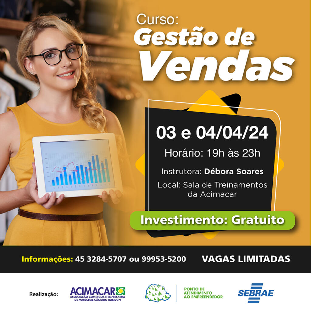 Nos dias 3 e 4 de abril, a Associação Comercial e Empresarial de Marechal Cândido Rondon (Acimacar), em parceria ao Ponto de Atendimento ao Empreendedor do Sebrae, promove o curso “Gestão de vendas”, com a instrutora Débora Soares.
