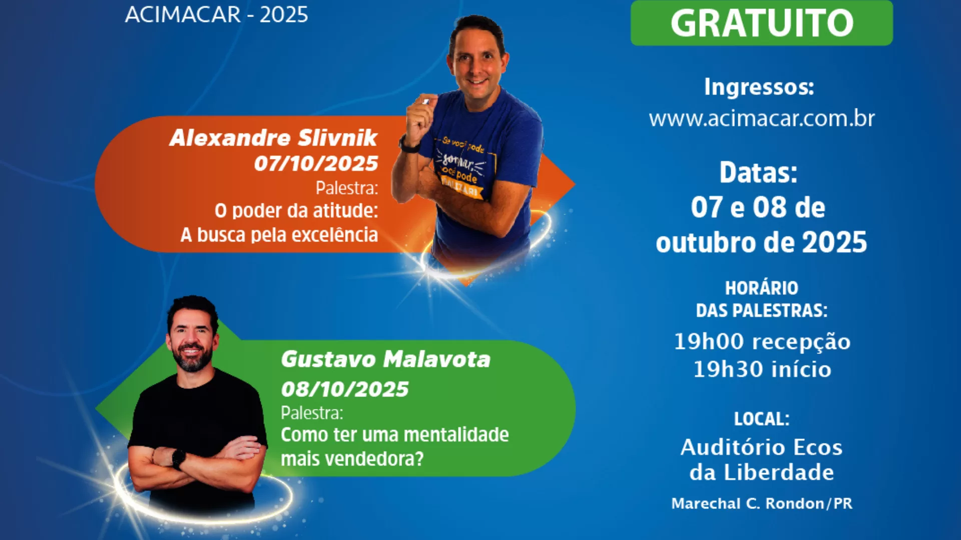 Já no dia 8 de outubro, quarta-feira, o palestrante será Gustavo Malavota, empresário, fundador do Instituto Vendas e mentor de grandes equipes comerciais. Ao longo de sua carreira, Malavota já treinou mais de 130 mil vendedores em todo o país. Em Marechal Cândido Rondon, ele vai compartilhar estratégias práticas de vendas e liderança com a palestra “Como ter uma mentalidade mais vendedora?”.