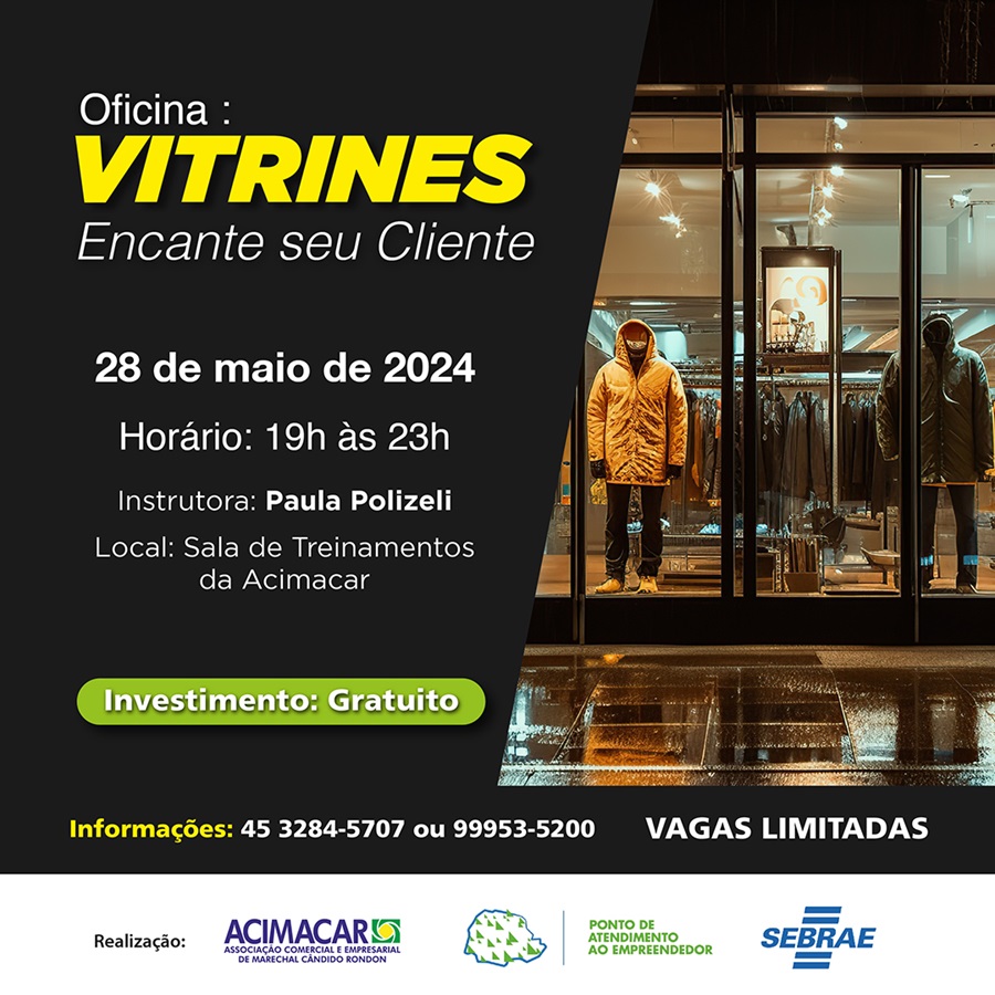Para auxiliar empresários e seus colaboradores a planejarem e executarem a vitrine de suas empresas e fecharem ainda mais negócios, a Associação Comercial e Empresarial de Marechal Cândido Rondon (Acimacar) promove, na terça-feira (28), uma oficina gratuita com o tema “Vitrines – encante seu cliente”.