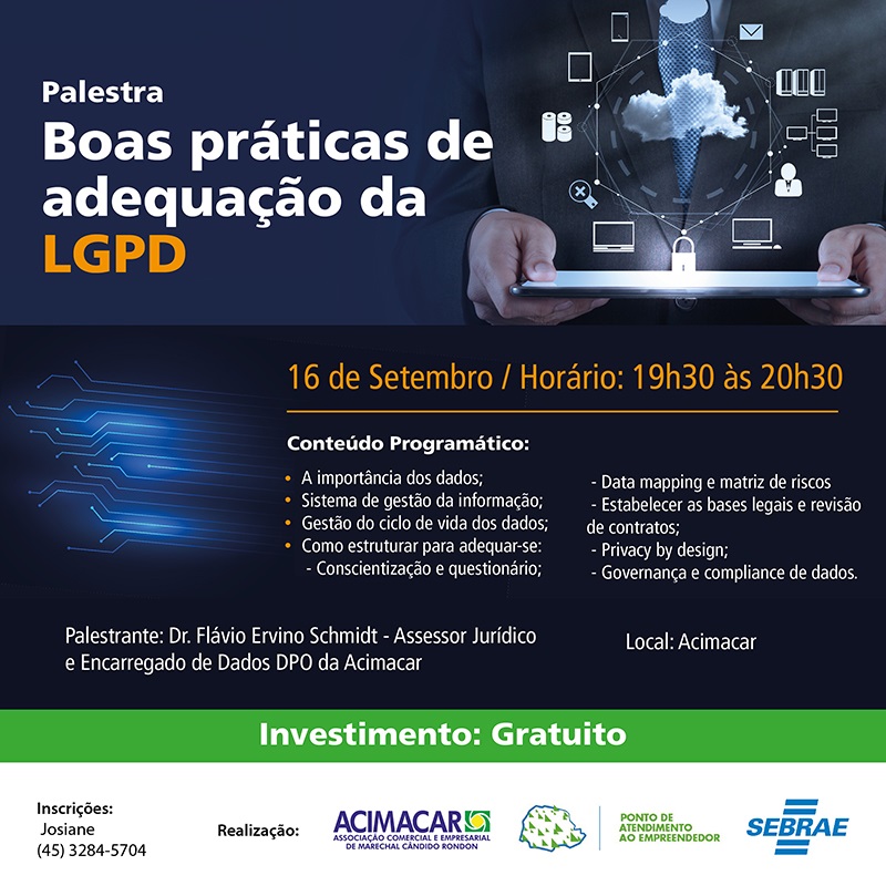 A Associação Comercial e Empresarial de Marechal Cândido Rondon (Acimacar) promove, no dia 16 de setembro, quinta-feira, a palestra “Boas práticas de adequação da LGPD”. A palestra é gratuita e acontece das 19h30 às 20h30 na sede da entidade.