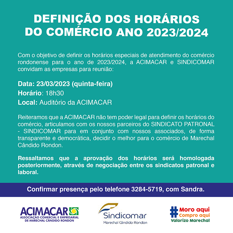 A fim de definir as datas e horários especiais de funcionamento das empresas do comércio varejista para os anos de 2023 e 2024, a Associação Comercial e Empresarial de Marechal Cândido Rondon (Acimacar) convida os empresários para que participem da reunião junto à entidade e ao Sindicato Empresarial do Comércio Varejista de Marechal Cândido Rondon e Microrregião (Sindicomar).