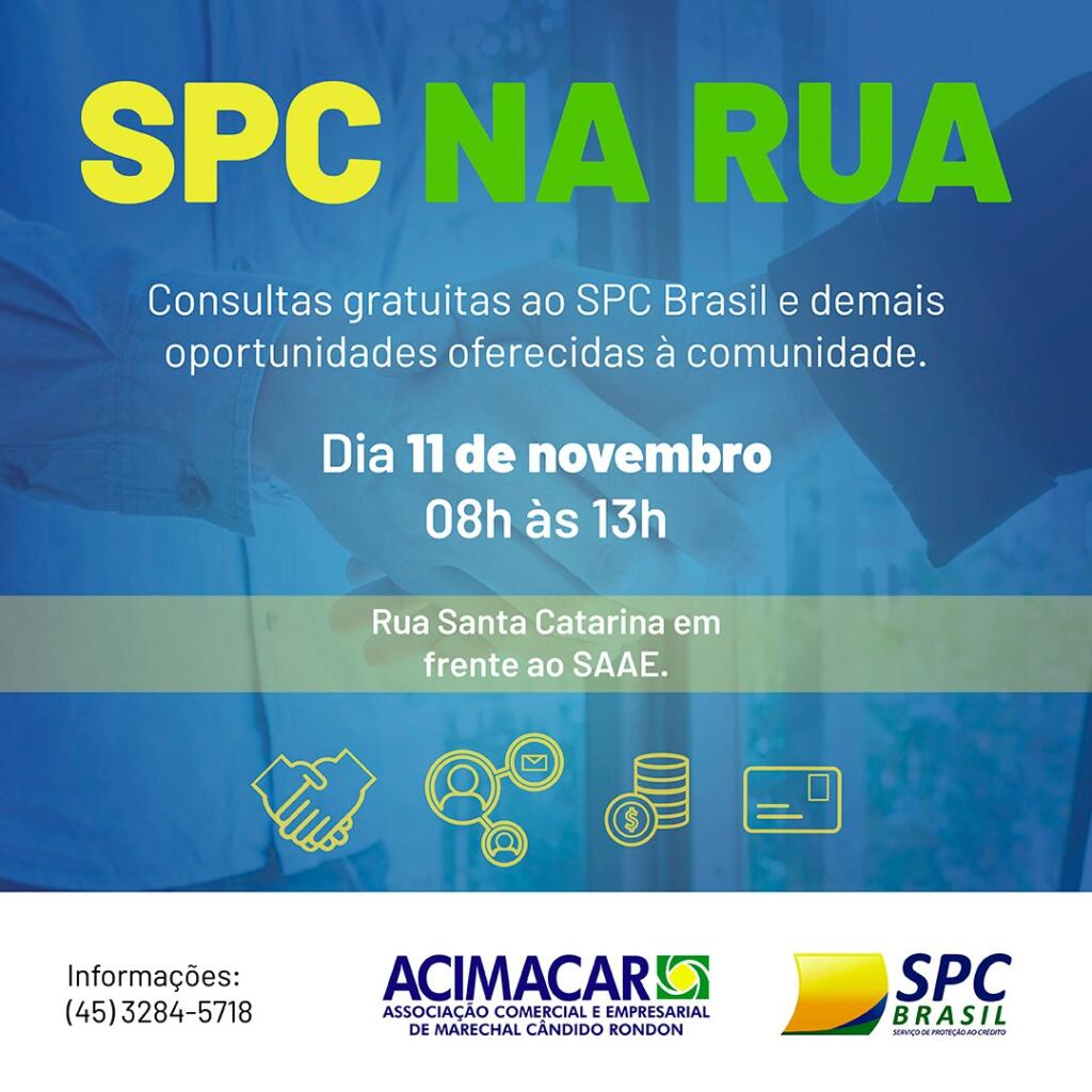 A Associação Comercial e Empresarial de Marechal Cândido Rondon (Acimacar) promove, neste sábado (11), o “SPC na Rua”, ação que possibilita aos consumidores realizarem consultas gratuitas ao banco de dados do SPC Brasil, para verificar possíveis pendências financeiras junto a empresas que utilizam o sistema.