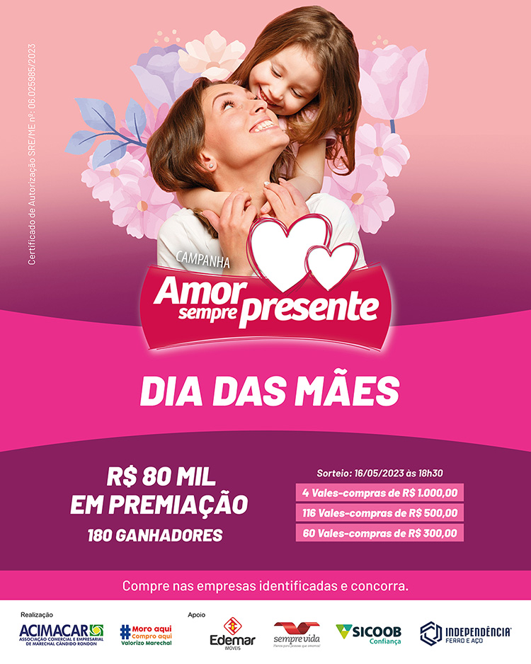 A campanha “Amor Sempre Presente” é realizada pela Acimacar em parceria com as empresas do comércio de Marechal Cândido Rondon, sendo legalizada pela Secretaria de Acompanhamento Fiscal, Energia e Loterias (Sefel) do Ministério da Fazenda.