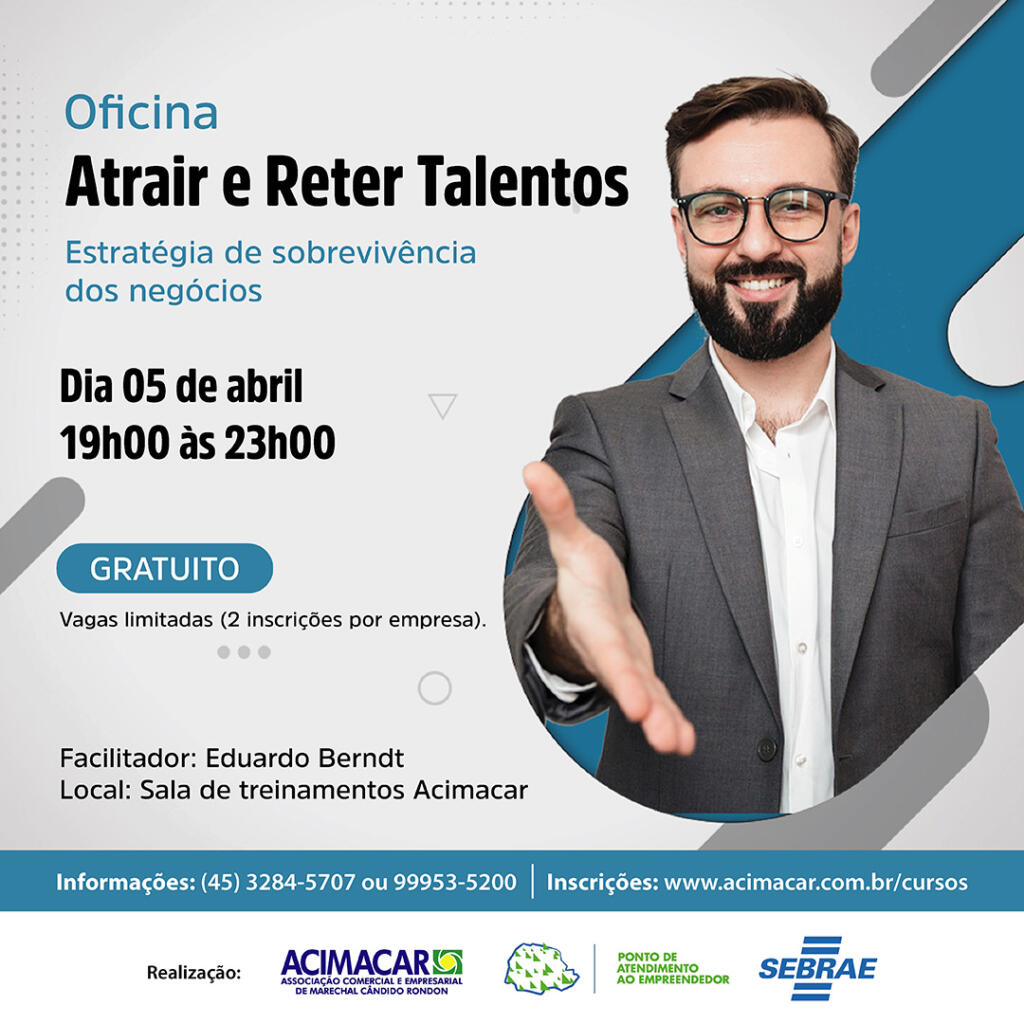 Com o objetivo de levar os participantes a uma percepção mais abrangente do conceito “talento”, considerando as características e o potencial de cada colaborador e, a partir dessa percepção, proporem estratégias de desenvolvimento e retenção, que viabilizem a permanência dos indivíduos da equipe, atendendo as necessidades e expectativas próprias e da organização, a Associação Comercial e Empresarial de Marechal Cândido Rondon (Acimacar), em parceria ao Ponto de Atendimento do Empreendedor do Serviço Brasileiro de Apoio às Micro e Pequenas Empresas (Sebrae), realiza a oficina gratuita “Atrair e Reter Talentos – Estratégia de Sobrevivência dos Negócios” na quarta-feira (5).