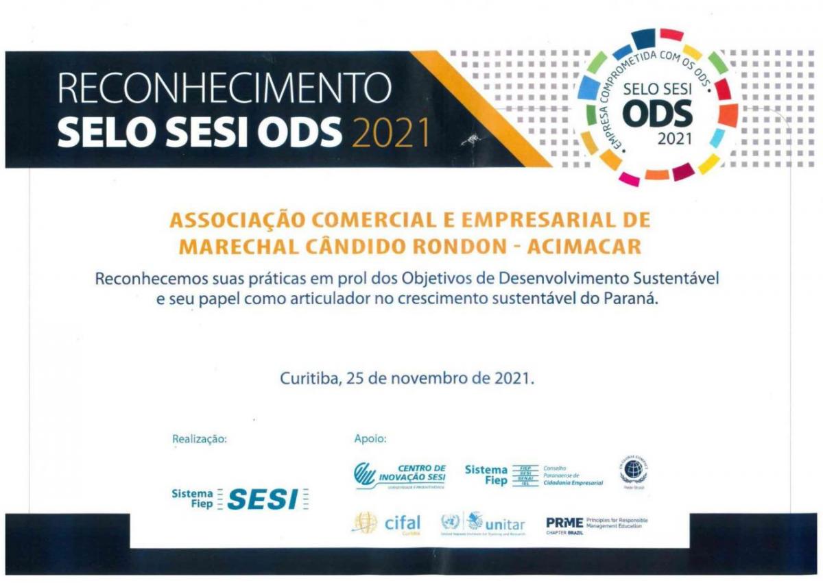 A Associação Comercial e Empresarial de Marechal Cândido Rondon (Acimacar), foi agraciada, pelo terceiro ano consecutivo, com o Selo Sesi ODS.