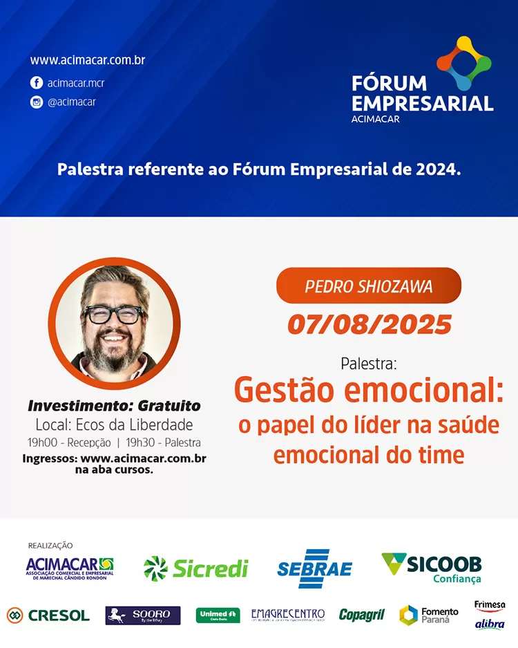 Inicialmente prevista para a edição de 2024 do Fórum Empresarial promovido pela entidade, a participação de Shiozawa foi adiada por motivos de saúde do palestrante. Agora, a Acimacar retoma essa relevante discussão, oferecendo ao público a oportunidade de debater um dos temas mais urgentes do ambiente corporativo atual: a gestão emocional nas lideranças e seus impactos sobre os times.