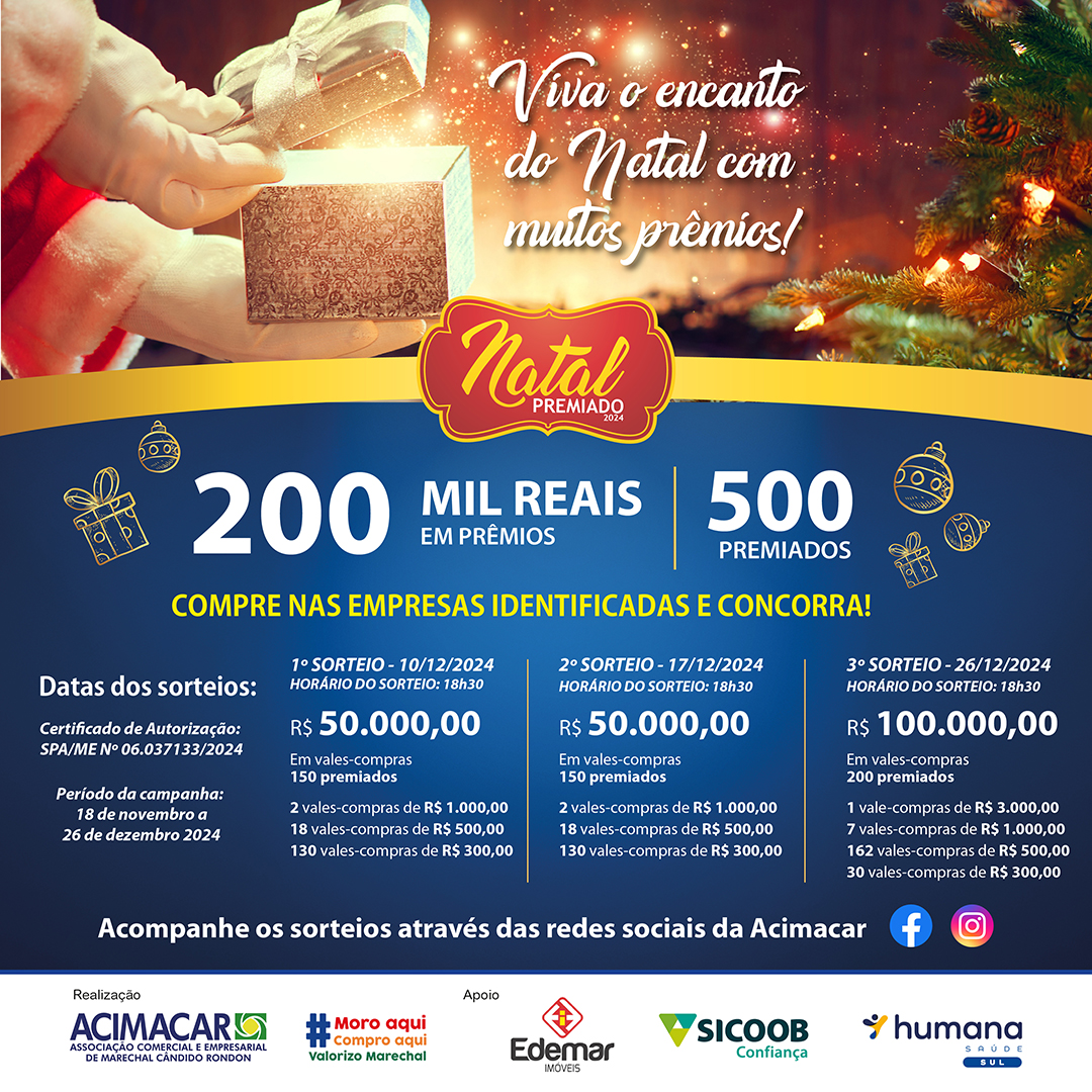 Na próxima terça-feira (17) acontece o segundo sorteio da Campanha Natal Premiado, promovida pela Associação Comercial e Empresarial de Marechal Cândido Rondon (Acimacar).