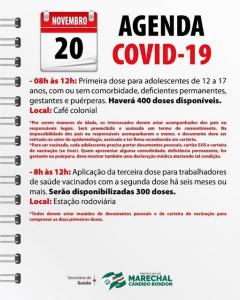 A Secretaria de Saúde de Marechal Cândido Rondon divulga o roteiro de vacinação contra a Covid-19 para este sábado (20). Em locais distintos, porém das 8 horas ao meio-dia, será aplicada a primeira dose da vacina nos adolescentes de 12 a 17 anos e a terceira dose nos trabalhadores da área da saúde.
