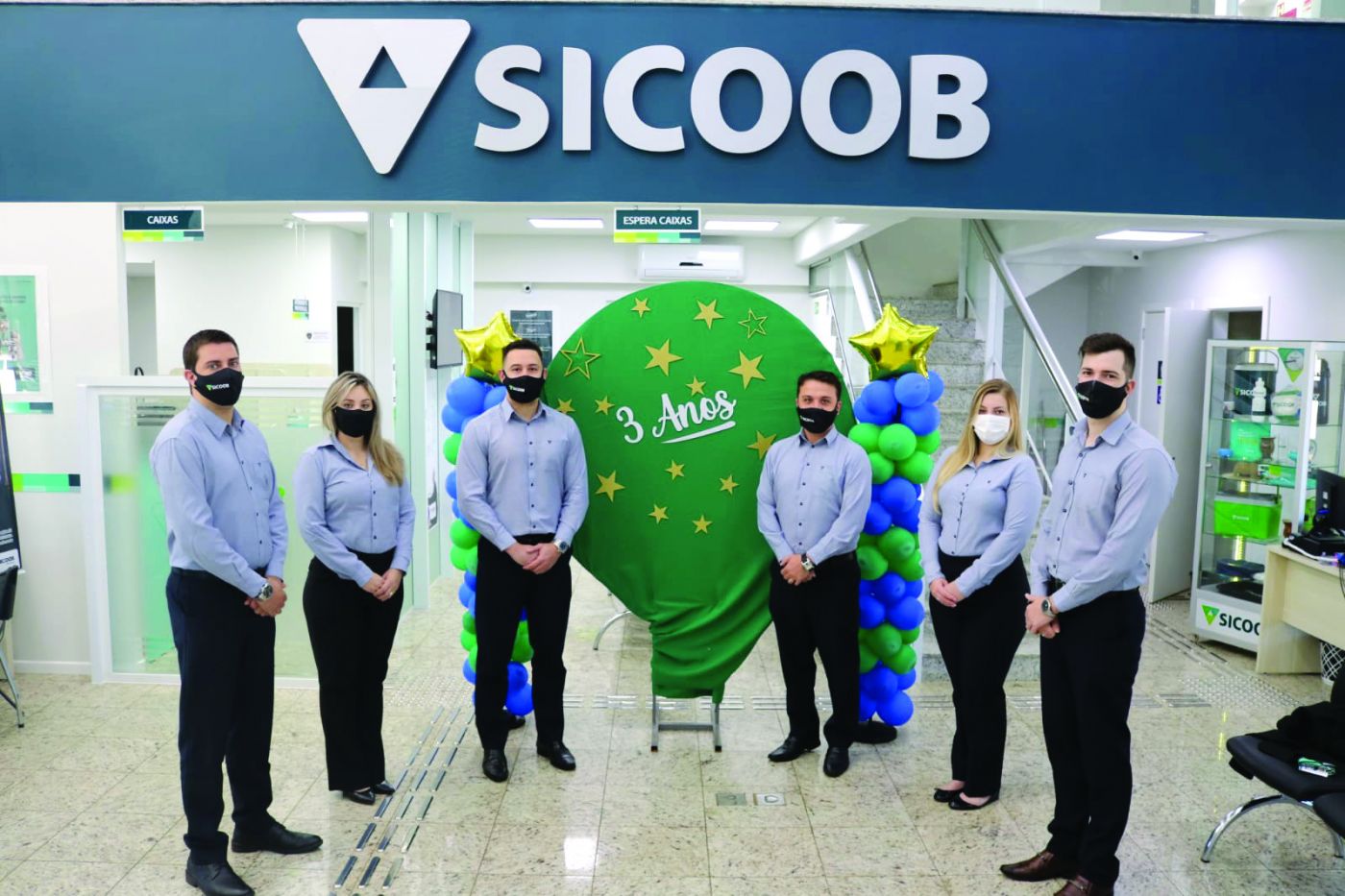 Equipe da agência Dom Pedro, localizada próxima à rodoviária rondonense, completou três anos de atividades no último dia 30 (Divulgação/Sicoob)