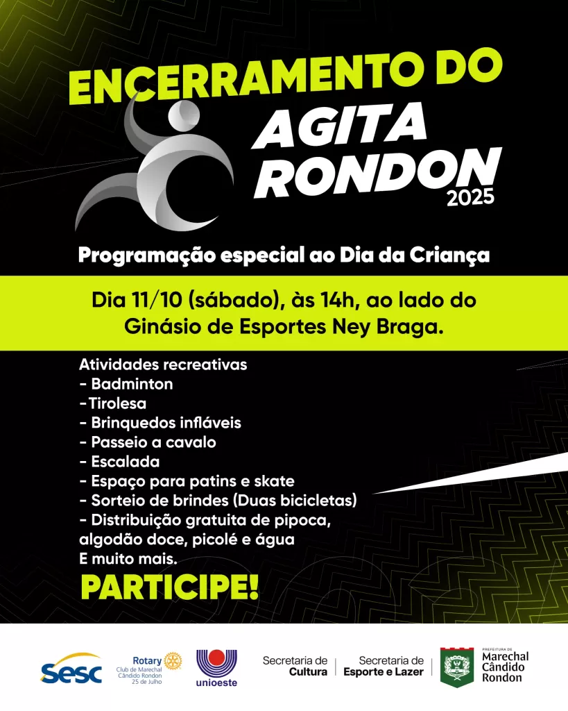 O clima de alegria e diversão vai tomar conta de Marechal Cândido Rondon neste sábado (11), com o encerramento do Agita Rondon 2025, evento promovido pela prefeitura, por meio da Secretaria de Esporte e Lazer. A programação será dedicada especialmente às crianças, em comemoração ao Dia da Criança, celebrado no dia 12 de outubro.