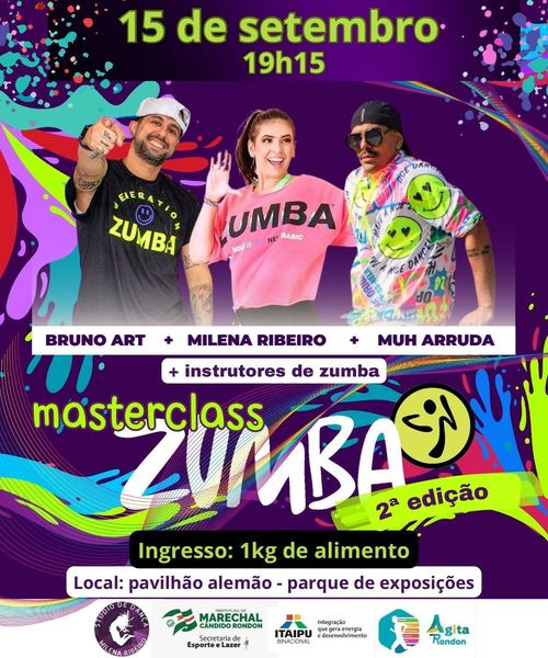 As atividades do 6º Agita Rondon terão sequência a partir de sexta-feira (15), no período da noite. Para as 19h15, no pavilhão alemão do parque de exposições de Marechal Cândido Rondon, está agendado o 2º Master Class de Zumba, com apresentações de Bruna Art, Milena Ribeiro e Muh Arruda. Para participar, a interessada deve levar um quilo de alimento.