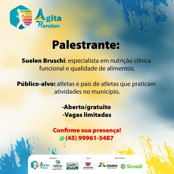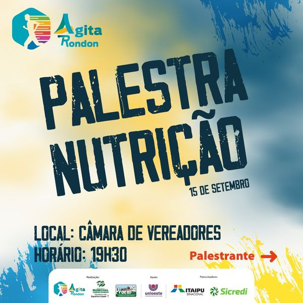 Já na Câmara Municipal será realizada palestra sobre nutrição, a ser ministrada por Suelen Bruschi, com início às 19h30. A especialista em nutrição clínica funcional e qualidade de alimentos palestrará para atletas e pais de atletas que praticam atividades no município. O evento é gratuito, mas as vagas são limitadas. Confirmações devem ser feitas pelo telefone/WhatsApp (45) 99961-5487.