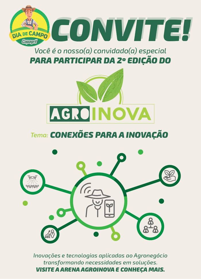 Um dos atrativos da programação será o AgroInova, que neste ano estará na 2ª edição. Trata-se de um evento desenvolvido com objetivo do fortalecimento do agronegócio na região, levando inovação e tecnologia para mais próximo dos produtores rurais.