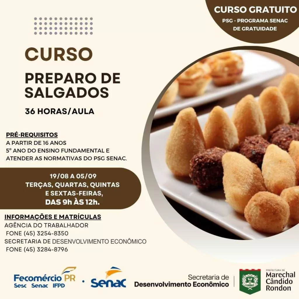 Já o curso de Preparo de Salgados começa no dia 19 de agosto, com o mesmo formato e carga horária.
