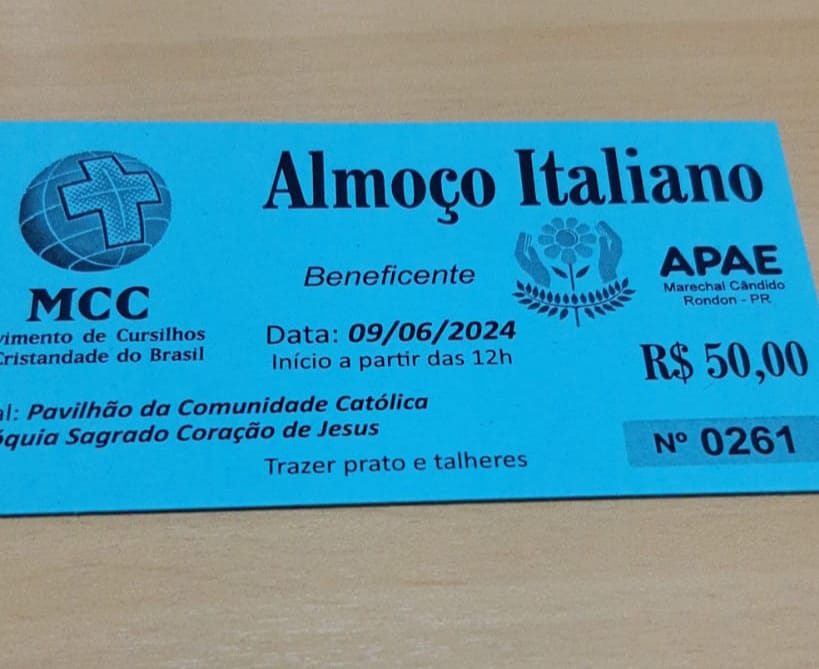 Trata-se do almoço italiano beneficente, que será realizado no pavilhão da Igreja Católica Paróquia Sagrado Coração de Jesus, a partir do meio-dia.