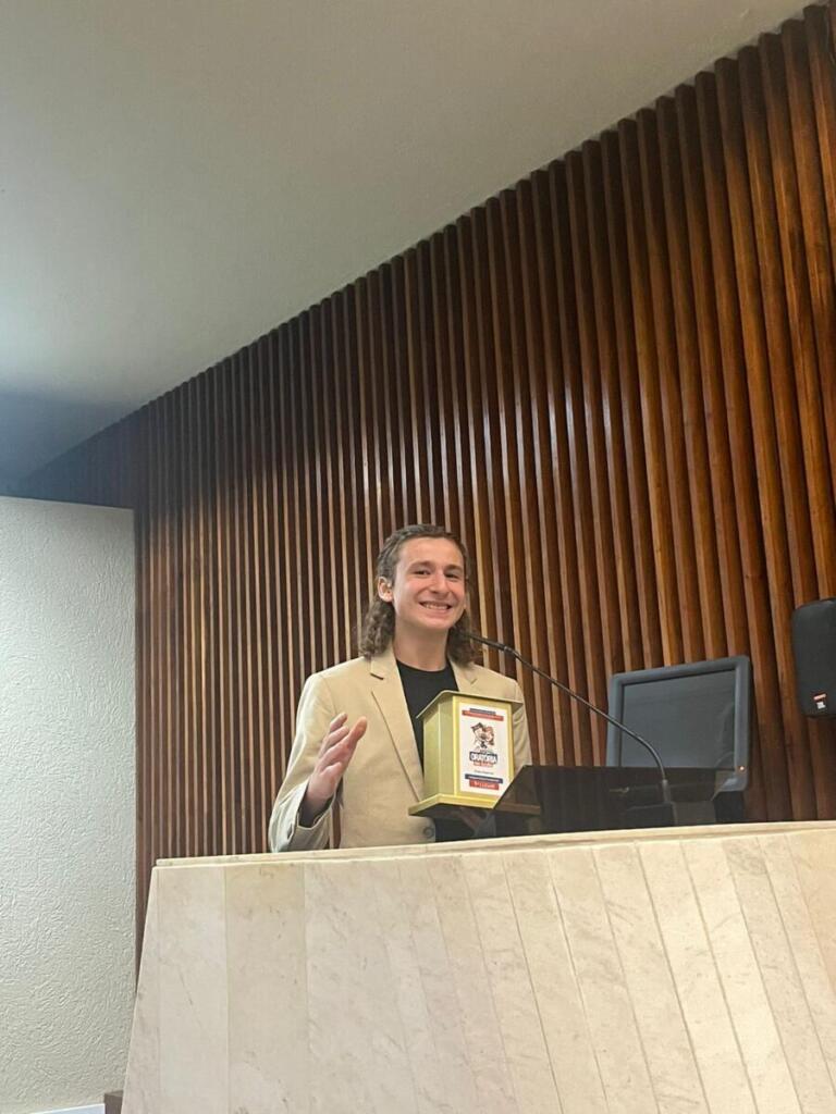Carlos Eduardo Pivotto Klein, do Colégio Integral, conquistou o primeiro lugar na categoria Oratória I – que envolve alunos dos 8º e 9º anos do Ensino Fundamental, e se classificou para a Etapa Nacional, que acontecerá em outubro na cidade de Maravilha (SC).