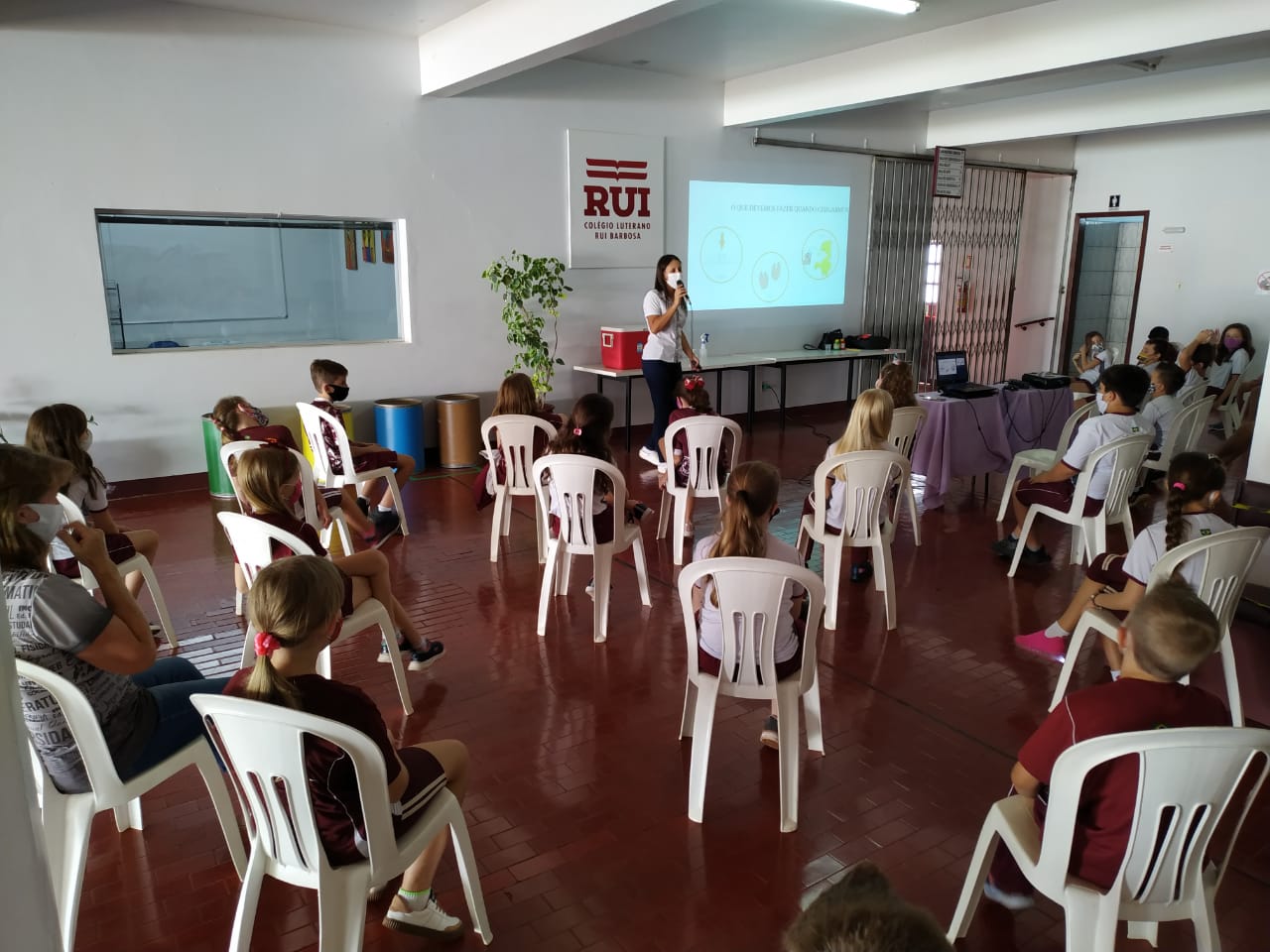 Os estudantes do 4º e 5º ano do Colégio Luterano Rui Barbosa participaram no dia 25 de fevereiro de uma palestra com a enfermeira Pamela Ferreira de Souza, profissional do Grupo Sempre Vida. Os objetivos foram: reforçar sobre os cuidados de prevenção da Covid-19, dar explicações sobre a vacina e realizar a entrega dos livros da Escola da Inteligência – essencial “imunizante” para as emoções.