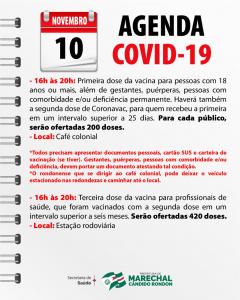 A Secretaria de Saúde de Marechal Cândido Rondon divulgou um amplo roteiro de vacinação contra a Covid-19 programado para esta quarta-feira (10). O cronograma está voltado para diferentes públicos, todavia a aplicação da vacina ocorre apenas entre 16 e 20 horas.