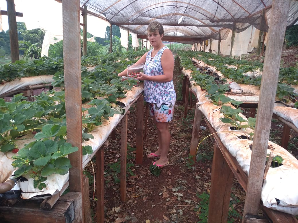 Moradora na Linha Wilhelms, distrito de Margarida, Helena Maria Schoffen Ratz cultiva morango há quatro anos em uma estufa de 150 metros quadrados. “Não é difícil, mas é preciso sempre estar alerta”, comenta. “Um dia pode não ter nada, mas no outro pode ter ácaro, pulgão, cochinilha. Quanto mais dias você ficar sem observar, mais difícil vai ser o controle”, enaltece.