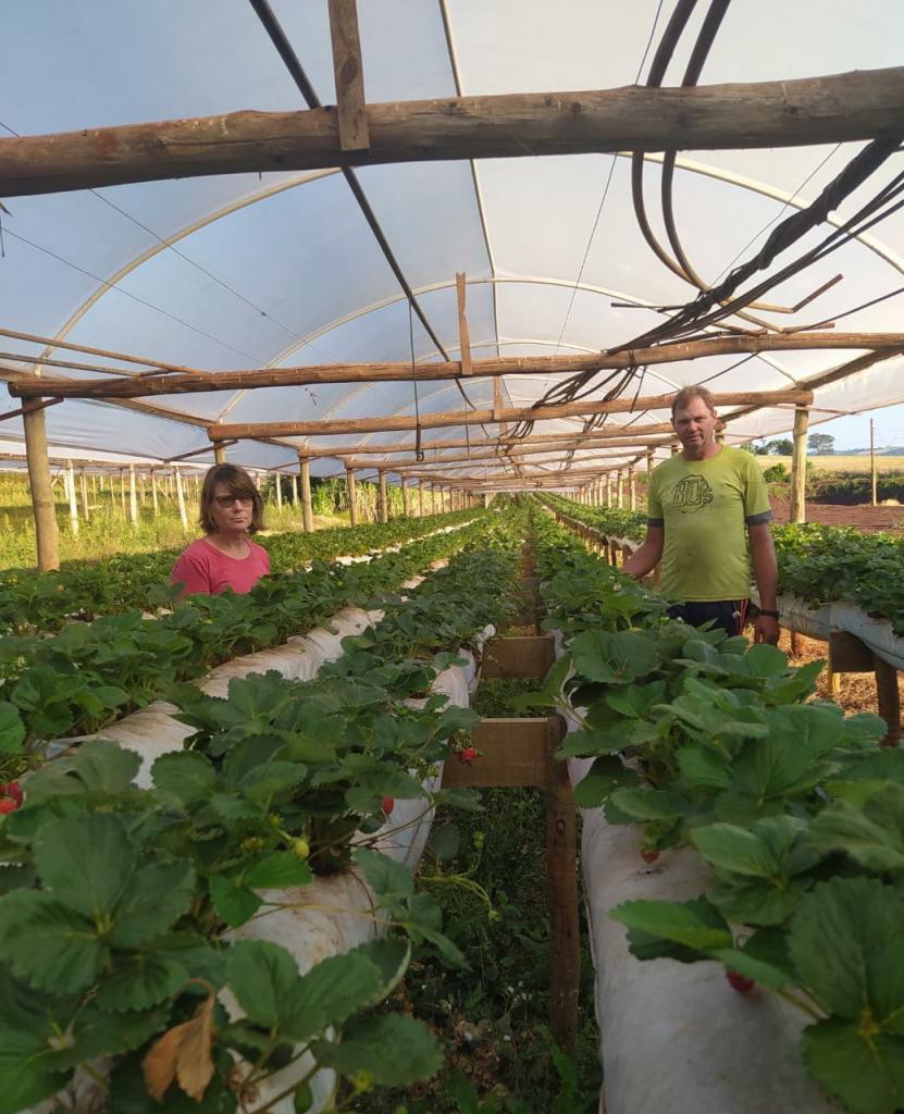 Ruzana e Inácio Vorpagel, agricultores da Vila Rural Santa Clara, cultivam morango há 15 anos. Eles aprenderam sozinhos as técnicas de cultivo e já chegaram a plantar cerca de quatro mil pés. “Devido às condições climáticas, a colheita foi fraca. Em torno de 300 quilos por ano. Em outras épocas esse número chegou a mais de 600 quilos”, evidencia Ruzana.