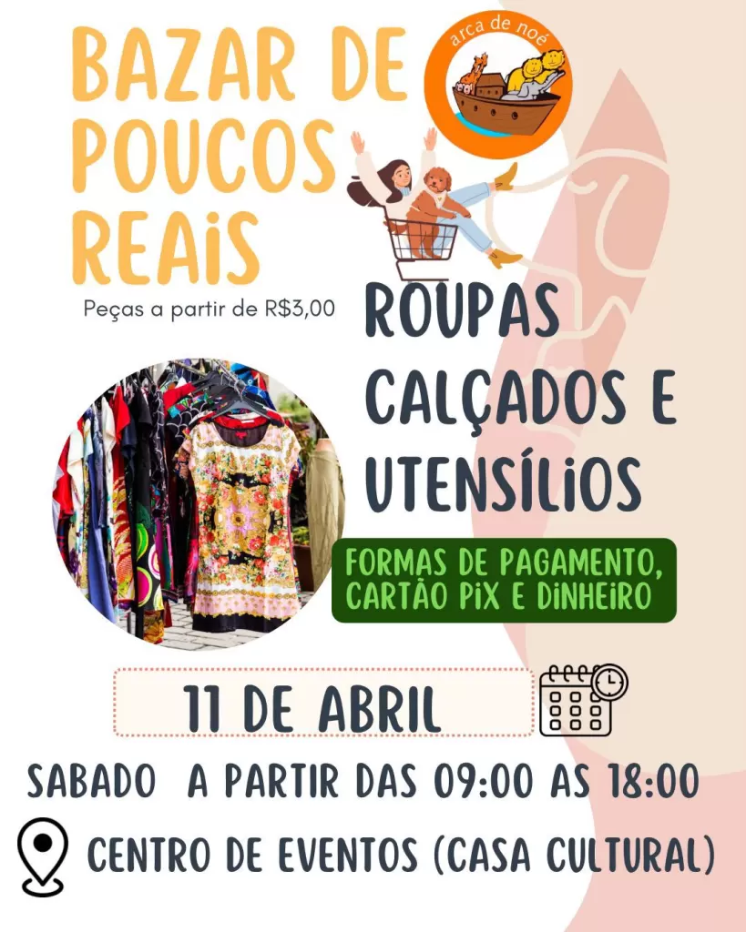 O bazar contará com a venda de roupas, calçados e utensílios, com valores a partir de apenas R$ 3,00. Além disso, os consumidores poderão realizar pagamentos de forma prática, utilizando cartão, PIX ou dinheiro.