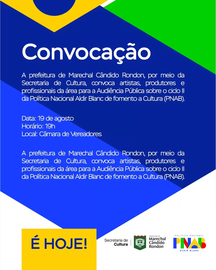 A prefeitura de Marechal Cândido Rondon, por meio da Secretaria de Cultura, promove uma audiência pública nesta terça-feira (19), às 19 horas, na Câmara de Vereadores. O encontro integra o Ciclo II da Política Nacional Aldir Blanc de Fomento à Cultura (PNAB) e tem como objetivo discutir, de forma participativa, a elaboração do Plano de Aplicação dos Recursos (PAR) para os próximos quatro anos.